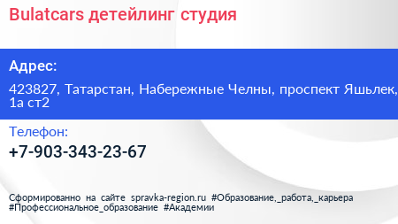 Bulatcars, детейлинг-студия по адресу 423827, Татарстан, Набережные Челны, проспект Яшьлек, 1а ст2 в дальнейшем Организация, размещена в следующих категориях: