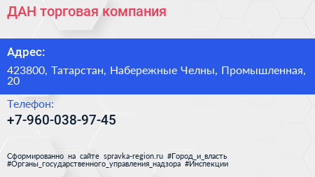 ДАН, торговая компания по адресу 423800, Татарстан, Набережные Челны, Промышленная, 20 в дальнейшем Организация, размещена в следующих категориях: