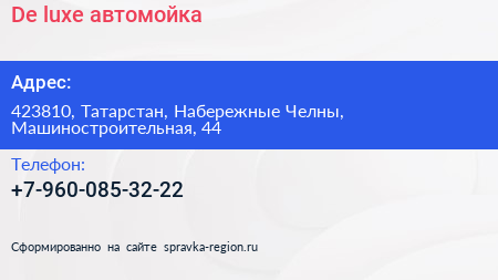 De luxe, автомойка по адресу 423810, Татарстан, Набережные Челны, Машиностроительная, 44 в дальнейшем Организация, размещена в следующих категориях: