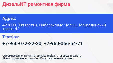 ДизельNT, ремонтная фирма по адресу 423800, Татарстан, Набережные Челны, Мензелинский тракт, 44 в дальнейшем Организация, размещена в следующих категориях: