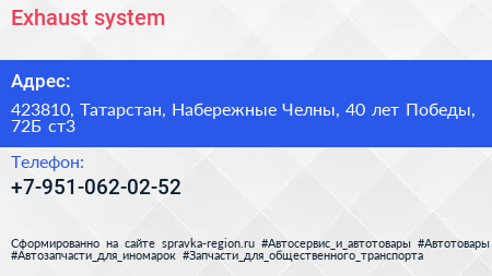 Exhaust system по адресу 423810, Татарстан, Набережные Челны, 40 лет Победы, 72Б ст3 в дальнейшем Организация, размещена в следующих категориях: