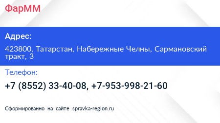 ФарММ по адресу 423800, Татарстан, Набережные Челны, Сармановский тракт, 3 в дальнейшем Организация, размещена в следующих категориях: