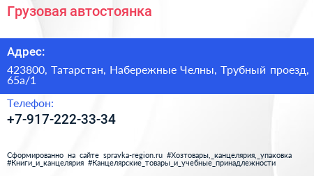 Грузовая автостоянка по адресу 423800, Татарстан, Набережные Челны, Трубный проезд, 65а/1 в дальнейшем Организация, размещена в следующих категориях: