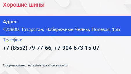 Хорошие шины по адресу 423800, Татарстан, Набережные Челны, Полевая, 15Б в дальнейшем Организация, размещена в следующих категориях: