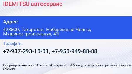 IDEMITSU, автосервис по адресу 423800, Татарстан, Набережные Челны, Машиностроительная, 43 в дальнейшем Организация, размещена в следующих категориях: