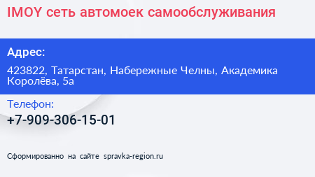 IMOY, сеть автомоек самообслуживания по адресу 423822, Татарстан, Набережные Челны, Академика Королёва, 5а в дальнейшем Организация, размещена в следующих категориях: