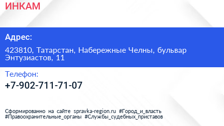 ИНКАМ по адресу 423810, Татарстан, Набережные Челны, бульвар Энтузиастов, 11 в дальнейшем Организация, размещена в следующих категориях: