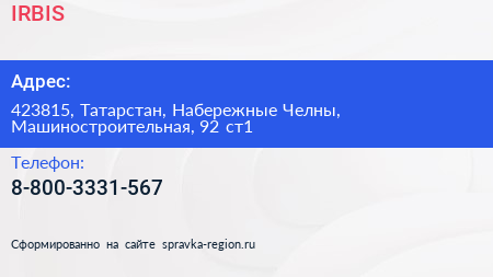 IRBIS по адресу 423815, Татарстан, Набережные Челны, Машиностроительная, 92 ст1 в дальнейшем Организация, размещена в следующих категориях: