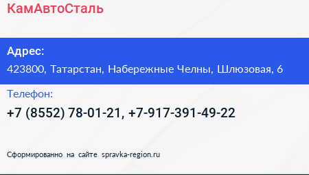 КамАвтоСталь по адресу 423800, Татарстан, Набережные Челны, Шлюзовая, 6 в дальнейшем Организация, размещена в следующих категориях: