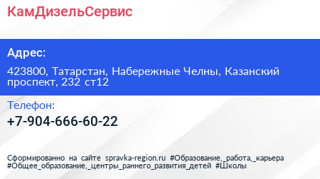 КамДизельСервис по адресу 423800, Татарстан, Набережные Челны, Казанский проспект, 232 ст12 в дальнейшем Организация, размещена в следующих категориях: