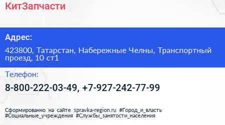 КитЗапчасти по адресу 423800, Татарстан, Набережные Челны, Транспортный проезд, 10 ст1 в дальнейшем Организация, размещена в следующих категориях: