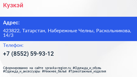 Кузкэй по адресу 423822, Татарстан, Набережные Челны, Раскольникова, 14/3 в дальнейшем Организация, размещена в следующих категориях: