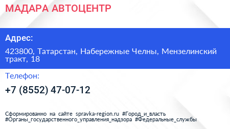 МАДАРА АВТОЦЕНТР по адресу 423800, Татарстан, Набережные Челны, Мензелинский тракт, 18 в дальнейшем Организация, размещена в следующих категориях: