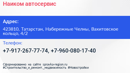 Наиком, автосервис по адресу 423810, Татарстан, Набережные Челны, Вахитовское кольцо, 4/2 в дальнейшем Организация, размещена в следующих категориях: