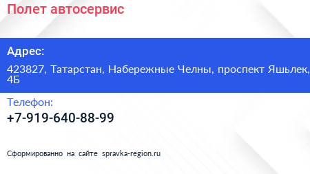 Полет, автосервис по адресу 423827, Татарстан, Набережные Челны, проспект Яшьлек, 4Б в дальнейшем Организация, размещена в следующих категориях: