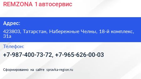 REMZONA№1, автосервис по адресу 423803, Татарстан, Набережные Челны, 18-й комплекс, 31а в дальнейшем Организация, размещена в следующих категориях: