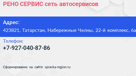 РЕНО СЕРВИС, сеть автосервисов по адресу 423821, Татарстан, Набережные Челны, 22-й комплекс, 6а в дальнейшем Организация, размещена в следующих категориях: