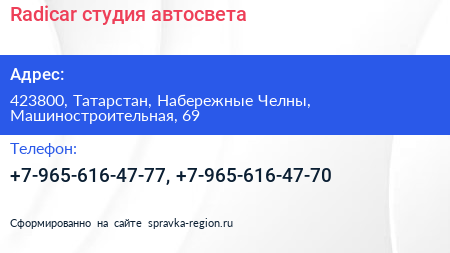 Radicar, студия автосвета по адресу 423800, Татарстан, Набережные Челны, Машиностроительная, 69 в дальнейшем Организация, размещена в следующих категориях: