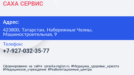 САХА-СЕРВИС по адресу 423800, Татарстан, Набережные Челны, Машиностроительная, 9 в дальнейшем Организация, размещена в следующих категориях: