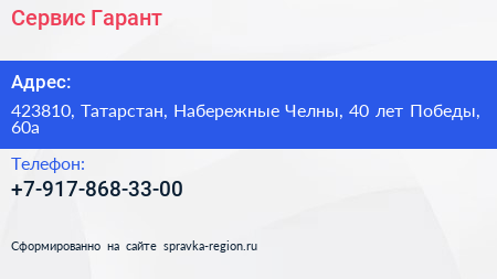 Сервис-Гарант по адресу 423810, Татарстан, Набережные Челны, 40 лет Победы, 60а в дальнейшем Организация, размещена в следующих категориях: