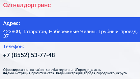 Сигналдортранс по адресу 423800, Татарстан, Набережные Челны, Трубный проезд, 37 в дальнейшем Организация, размещена в следующих категориях: