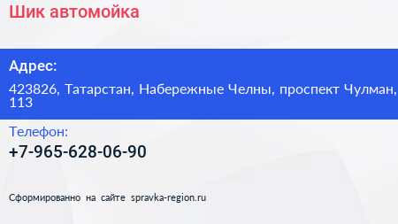 Шик, автомойка по адресу 423826, Татарстан, Набережные Челны, проспект Чулман, 113 в дальнейшем Организация, размещена в следующих категориях: