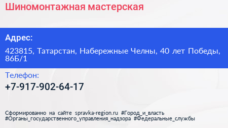 Шиномонтажная мастерская по адресу 423815, Татарстан, Набережные Челны, 40 лет Победы, 86Б/1 в дальнейшем Организация, размещена в следующих категориях: