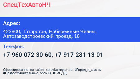 СпецТехАвтоНЧ по адресу 423800, Татарстан, Набережные Челны, Автозаводстроевский проезд, 18 в дальнейшем Организация, размещена в следующих категориях: