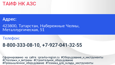 ТАИФ-НК АЗС по адресу 423800, Татарстан, Набережные Челны, Металлургическая, 51 в дальнейшем Организация, размещена в следующих категориях: