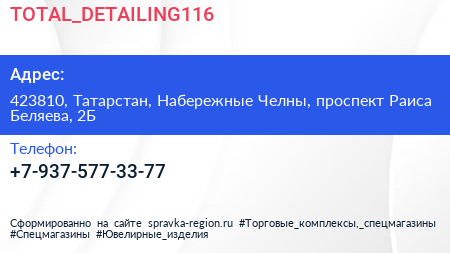 TOTAL_DETAILING116 по адресу 423810, Татарстан, Набережные Челны, проспект Раиса Беляева, 2Б в дальнейшем Организация, размещена в следующих категориях: