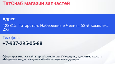 ТатСнаб, магазин запчастей по адресу 423815, Татарстан, Набережные Челны, 53-й комплекс, 29а в дальнейшем Организация, размещена в следующих категориях: