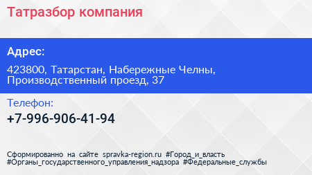 Татразбор, компания по адресу 423800, Татарстан, Набережные Челны, Производственный проезд, 37 в дальнейшем Организация, размещена в следующих категориях: