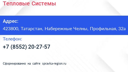 Тепловые Системы по адресу 423800, Татарстан, Набережные Челны, Профильная, 32а в дальнейшем Организация, размещена в следующих категориях: