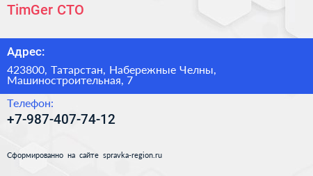 TimGer, СТО по адресу 423800, Татарстан, Набережные Челны, Машиностроительная, 7 в дальнейшем Организация, размещена в следующих категориях: