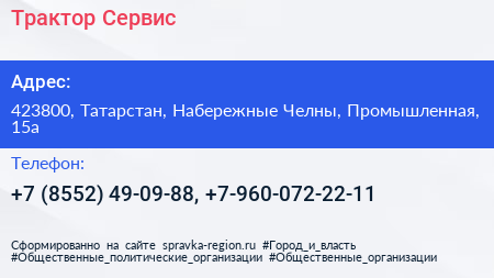 Трактор-Сервис+ по адресу 423800, Татарстан, Набережные Челны, Промышленная, 15а в дальнейшем Организация, размещена в следующих категориях: