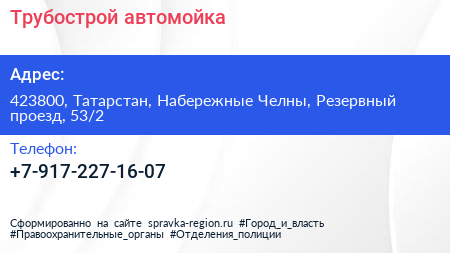 Трубострой, автомойка по адресу 423800, Татарстан, Набережные Челны, Резервный проезд, 53/2 в дальнейшем Организация, размещена в следующих категориях: