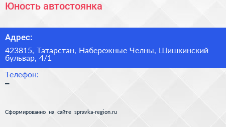 Юность, автостоянка по адресу 423815, Татарстан, Набережные Челны, Шишкинский бульвар, 4/1 в дальнейшем Организация, размещена в следующих категориях: