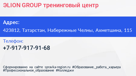 ЭLION GROUP, тренинговый центр по адресу 423812, Татарстан, Набережные Челны, Ахметшина, 115 в дальнейшем Организация, размещена в следующих категориях: