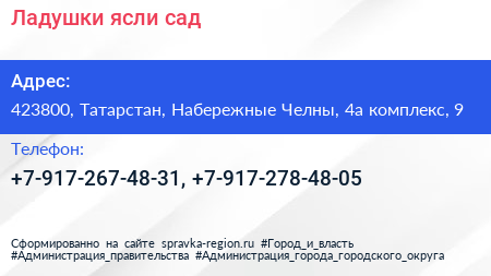 Ладушки, ясли-сад по адресу 423800, Татарстан, Набережные Челны, 4а комплекс, 9 в дальнейшем Организация, размещена в следующих категориях: