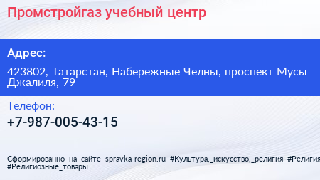 Промстройгаз, учебный центр по адресу 423802, Татарстан, Набережные Челны, проспект Мусы Джалиля, 79 в дальнейшем Организация, размещена в следующих категориях: