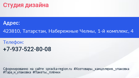 Студия дизайна по адресу 423810, Татарстан, Набережные Челны, 1-й комплекс, 4 в дальнейшем Организация, размещена в следующих категориях: