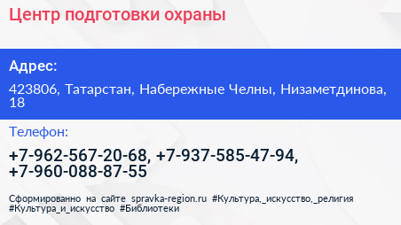 Центр подготовки охраны по адресу 423806, Татарстан, Набережные Челны, Низаметдинова, 18 в дальнейшем Организация, размещена в следующих категориях:
