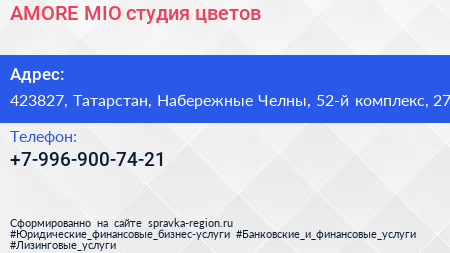 AMORE MIO, студия цветов по адресу 423827, Татарстан, Набережные Челны, 52-й комплекс, 27 в дальнейшем Организация, размещена в следующих категориях: