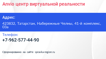 Anvio, центр виртуальной реальности по адресу 423832, Татарстан, Набережные Челны, 41-й комплекс, 03а в дальнейшем Организация, размещена в следующих категориях: