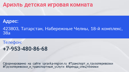 Ариэль, детская игровая комната по адресу 423803, Татарстан, Набережные Челны, 18-й комплекс, 38а в дальнейшем Организация, размещена в следующих категориях: