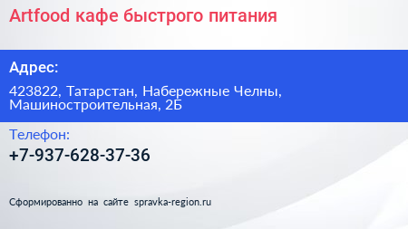 Artfood, кафе быстрого питания по адресу 423822, Татарстан, Набережные Челны, Машиностроительная, 2Б в дальнейшем Организация, размещена в следующих категориях: