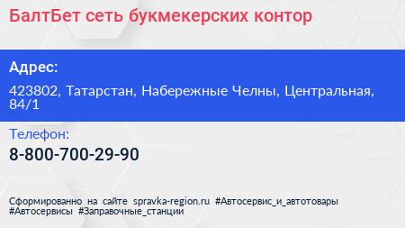 БалтБет, сеть букмекерских контор по адресу 423802, Татарстан, Набережные Челны, Центральная, 84/1 в дальнейшем Организация, размещена в следующих категориях: