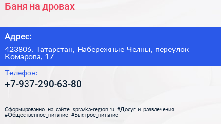 Баня на дровах по адресу 423806, Татарстан, Набережные Челны, переулок Комарова, 17 в дальнейшем Организация, размещена в следующих категориях:
