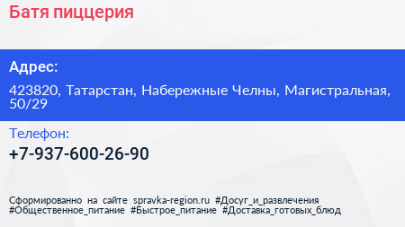 Батя, пиццерия по адресу 423820, Татарстан, Набережные Челны, Магистральная, 50/29 в дальнейшем Организация, размещена в следующих категориях: