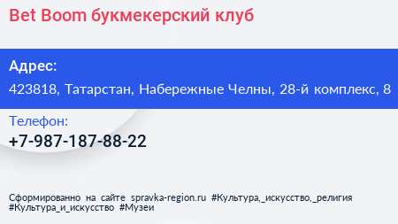 Bet Boom, букмекерский клуб по адресу 423818, Татарстан, Набережные Челны, 28-й комплекс, 8 в дальнейшем Организация, размещена в следующих категориях: